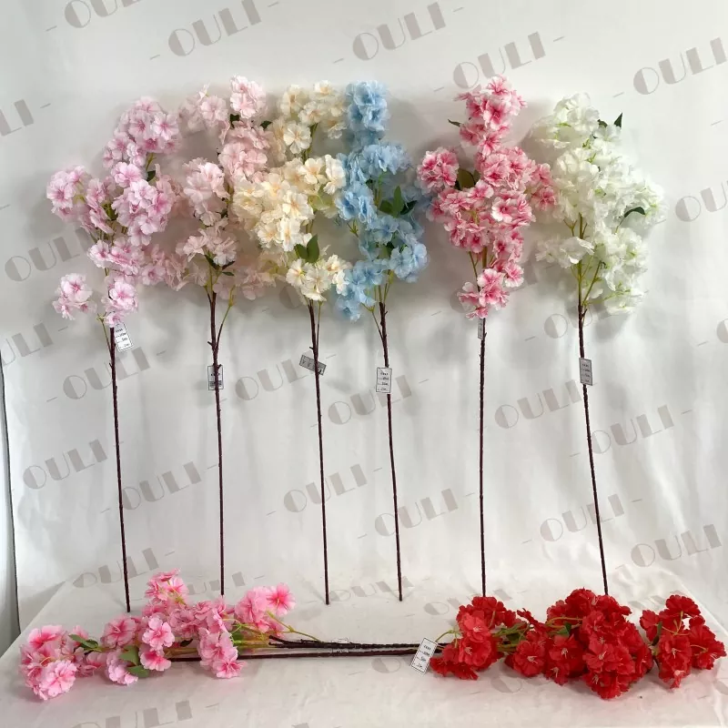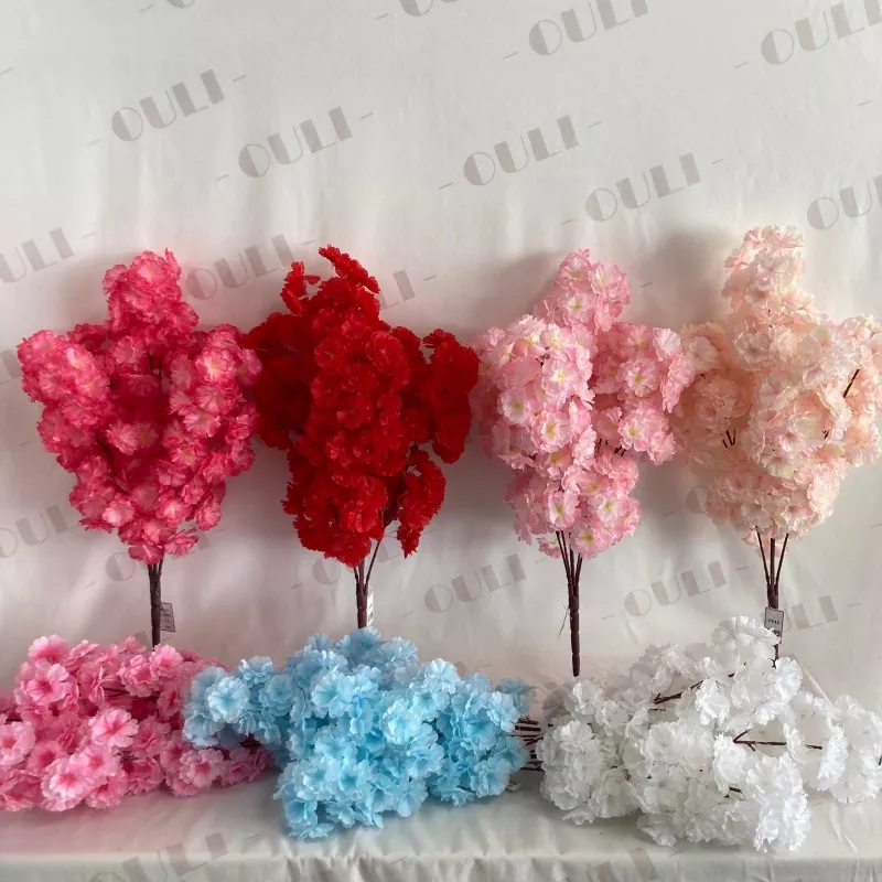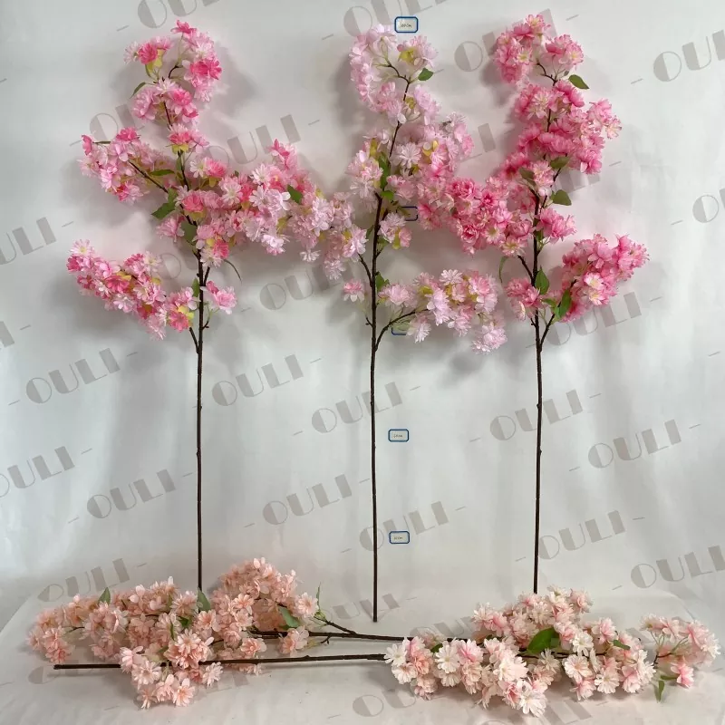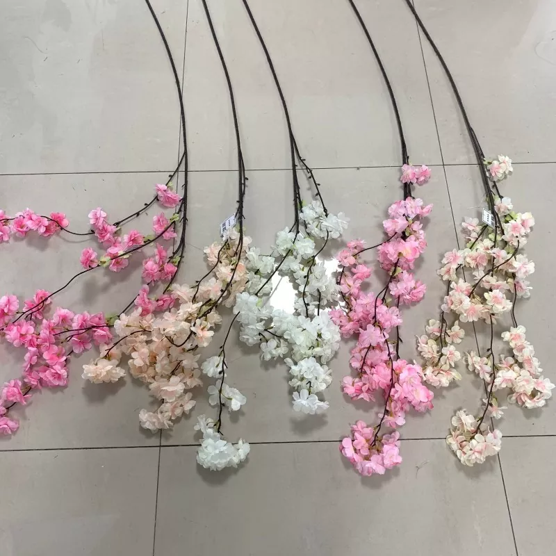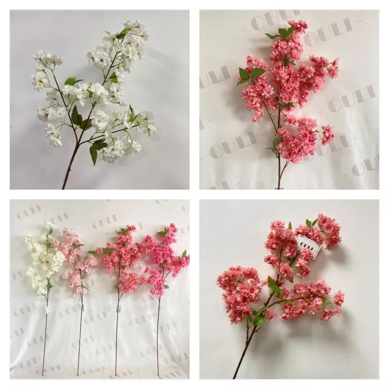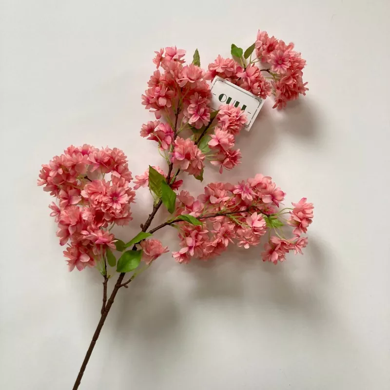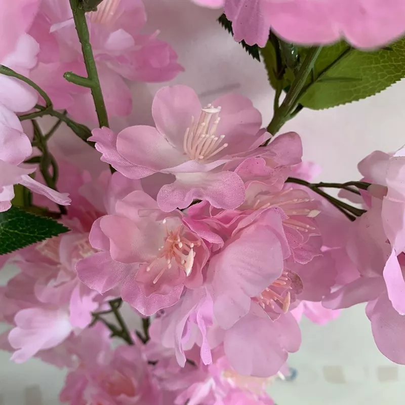 Cabang bunga sakura buatan menampilkan tiga lapisan kelopak sutra, benang sari merah muda, cabang lima bercabang, dan empat set daun hijau. Berdiri sekitar 63 cm (sekitar 2 inci) tinggi, cocok untuk berbagai pengaturan, termasuk dekorasi rumah dan pengaturan pernikahan.