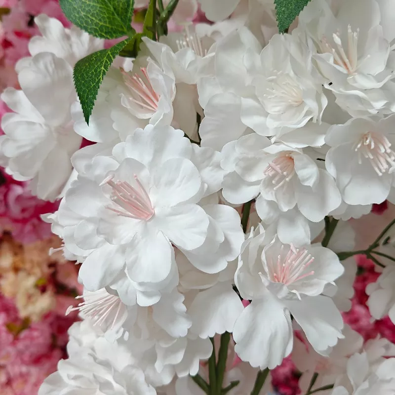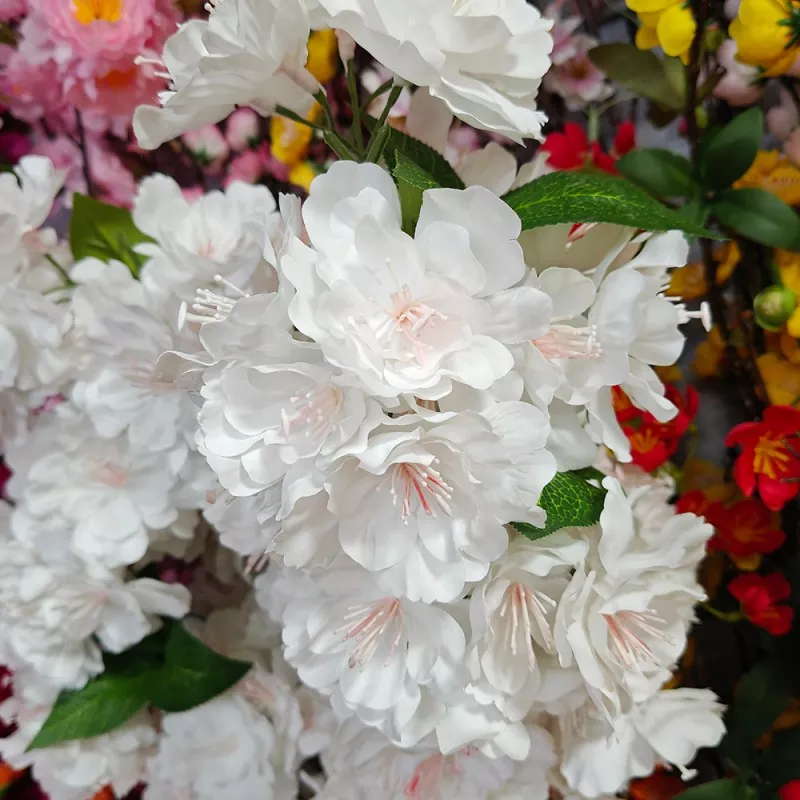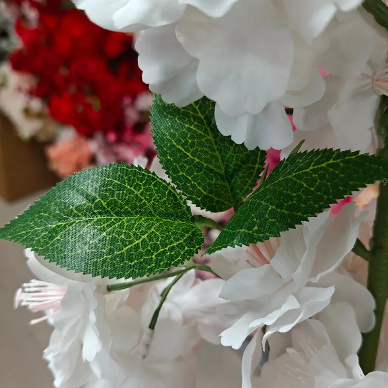 Bunga buatan bunga sakura putih telah diperlakukan dengan proses penghambat api. Baik daun dan bunga adalah retardant api, membuatnya cocok untuk digunakan di lingkungan yang membutuhkan perlindungan kebakaran tinggi.